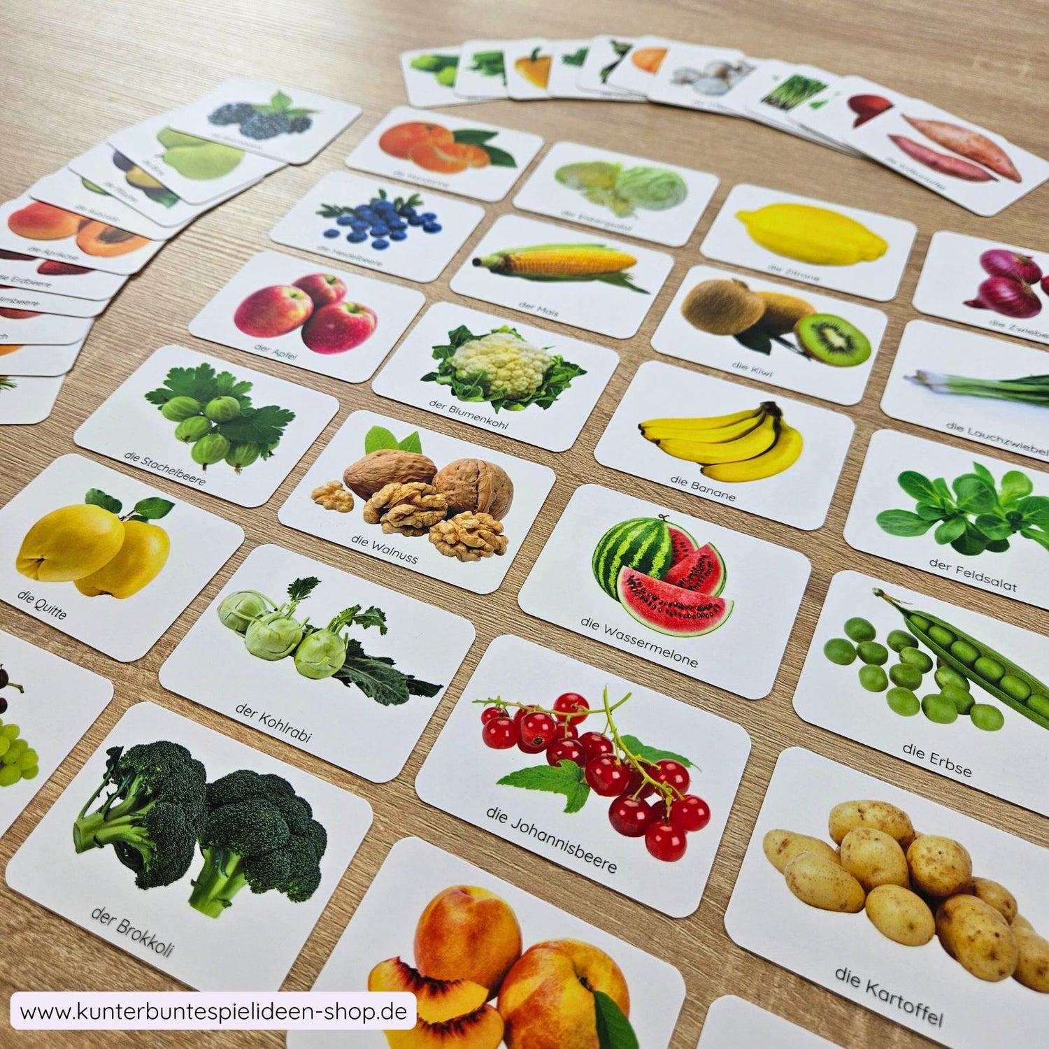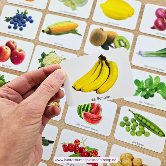 Obst- und Gemüse-Bildkarten mit Bezeichnung und Artikel– 46 Montessori-Karten mit realistischer Abbildung und Wortbezeichnung